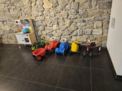 Durch mehrere Kinderwägen, darunter ein elektrisch betriebener "Kinderbus" sind wir mobil.